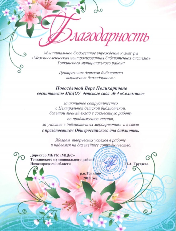 Благодарственное письмо Отдела образования администрации Тонкинского муниципального района
