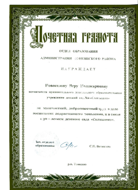 Грамота Отдела образования администрации Тонкинского муниципального района